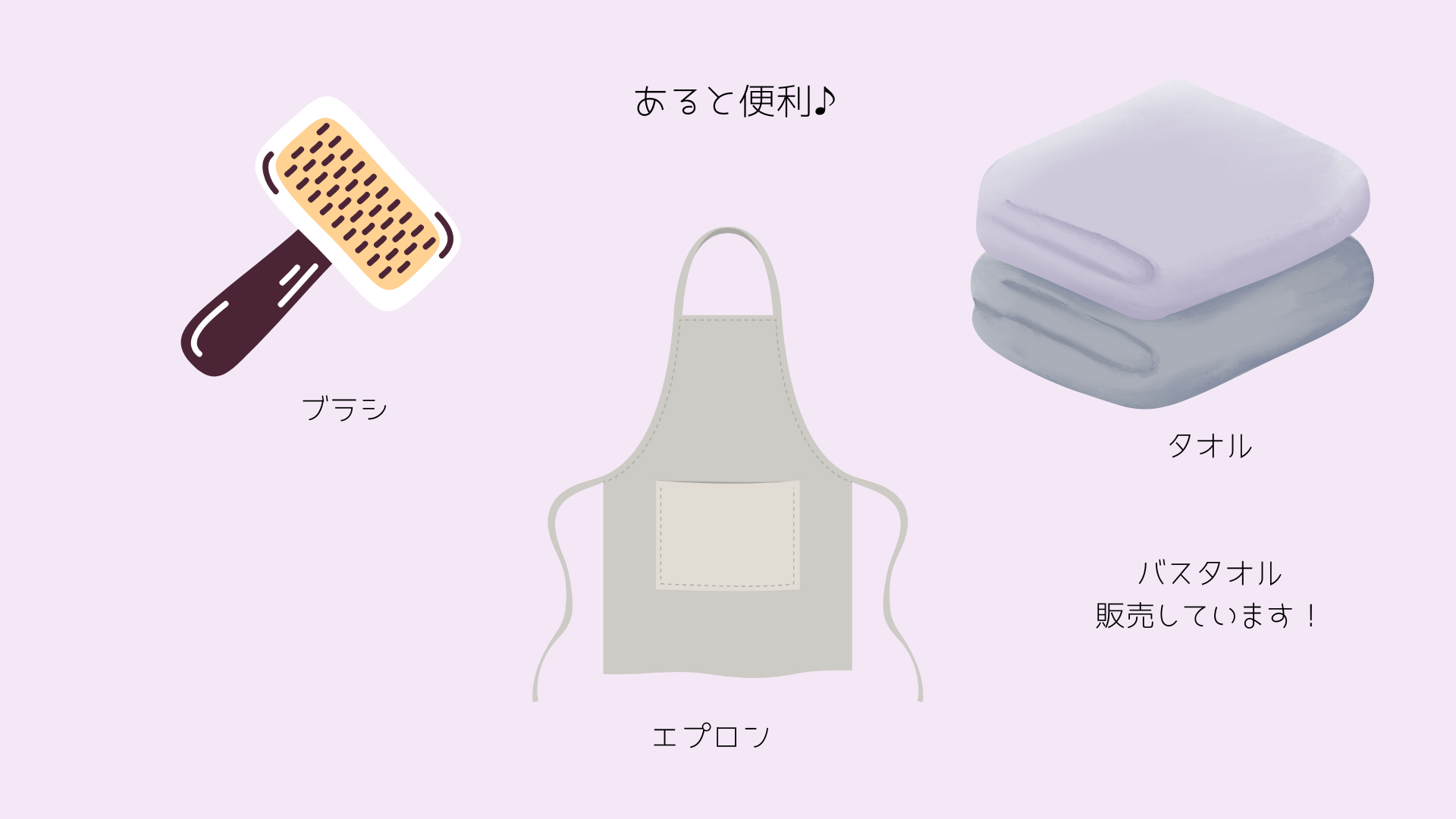 ご利用時間の目安 小型ワンちゃん 約 60分 中型、大型ワンちゃん 約 60分~90分 大型、超大型ワンちゃん、多頭飼いワンちゃん 約 60分~90分または120分 ※ 大きさ、被毛の長さ、毛量などの状態、ワンちゃんの頭数にもよりますので 不安な方はご予約前にお問い合わせください ※ 使用後のお掃除の時間を含め、ご予約をお願いしています |